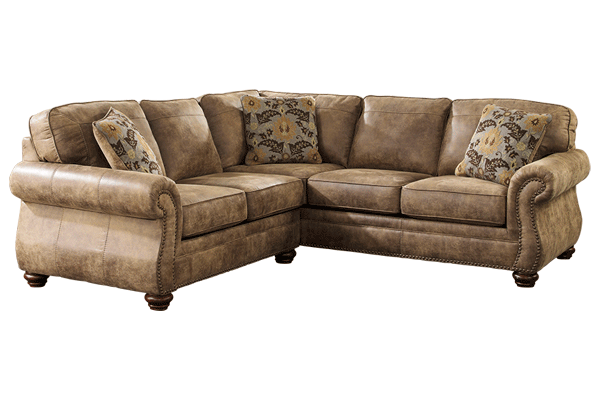 Beautifully designed with dramatic rolled arms, jumbo window pane stitched detailing and classic nail head trim accents, the “Larkinhurst-Earth” upholstery collection is covered in a soft leather look fabric that adds the ultimate in comfort while holding onto the classic traditional design that is sure to enhance any living room décor.